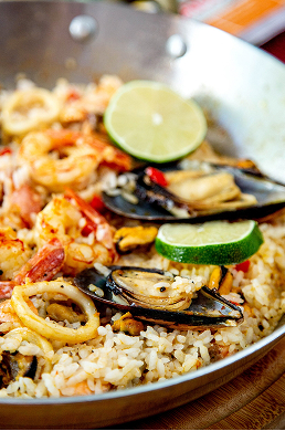 Arroz con gambas, calamares y mejillones, cocinado al estilo tradicional.